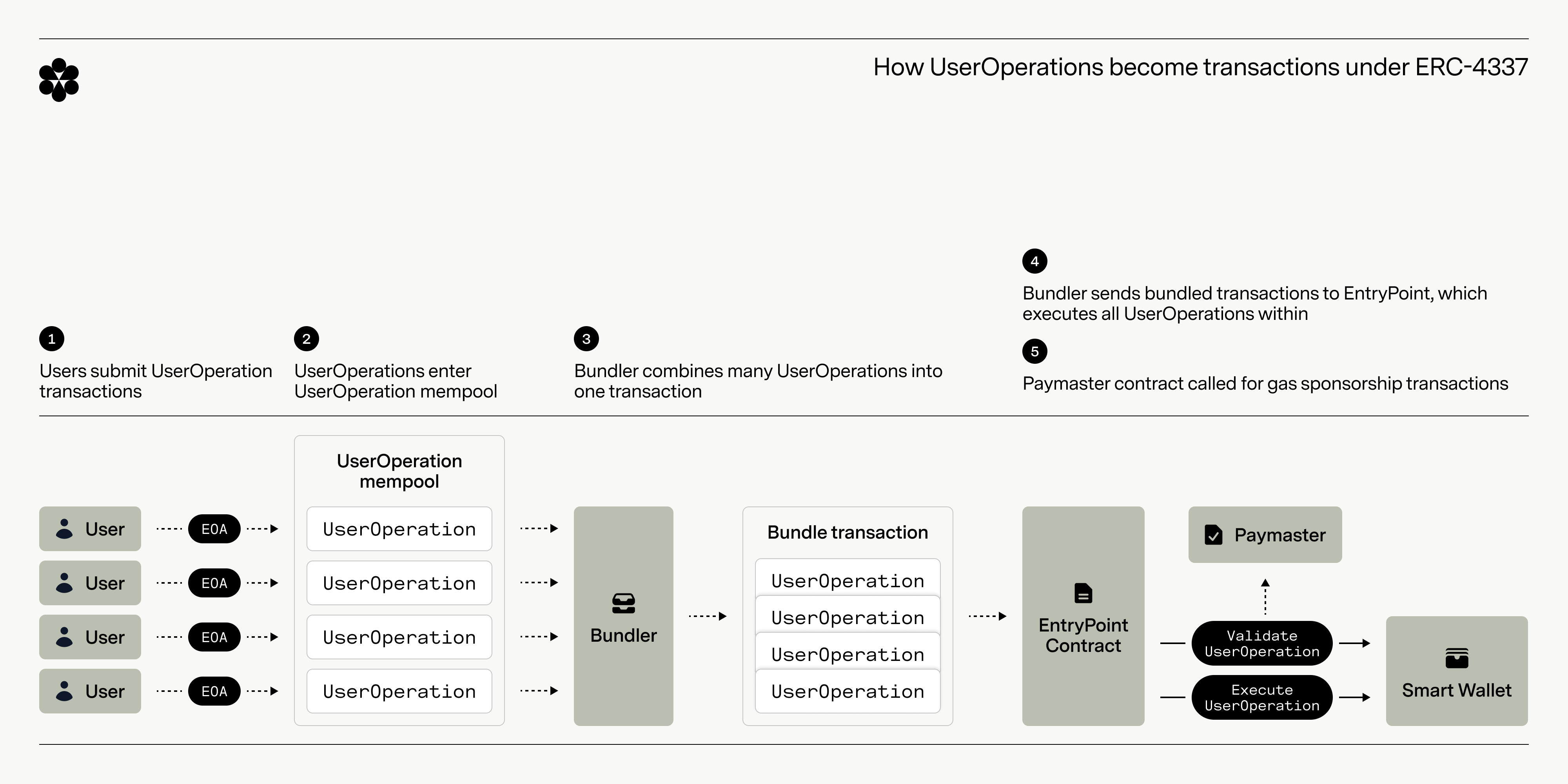 - The bundler sends the bundled transaction EntryPoint, a dedicated smart contract on Ethereum that validates each UserOperation in the bundled transaction and executes it on behalf of the smart wallet in question.