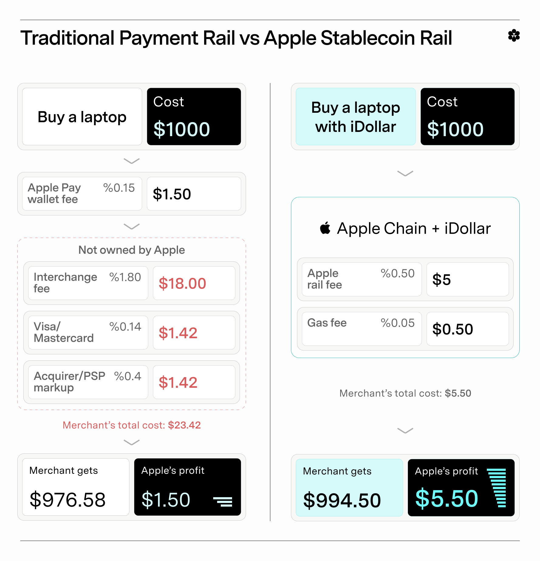 - Compliance: A dedicated chain would make it easier for Apple to KYC users, create whitelists for who can deploy contracts that touch iDollar, and comply with GENIUS Act rules around token freezes and clawbacks.