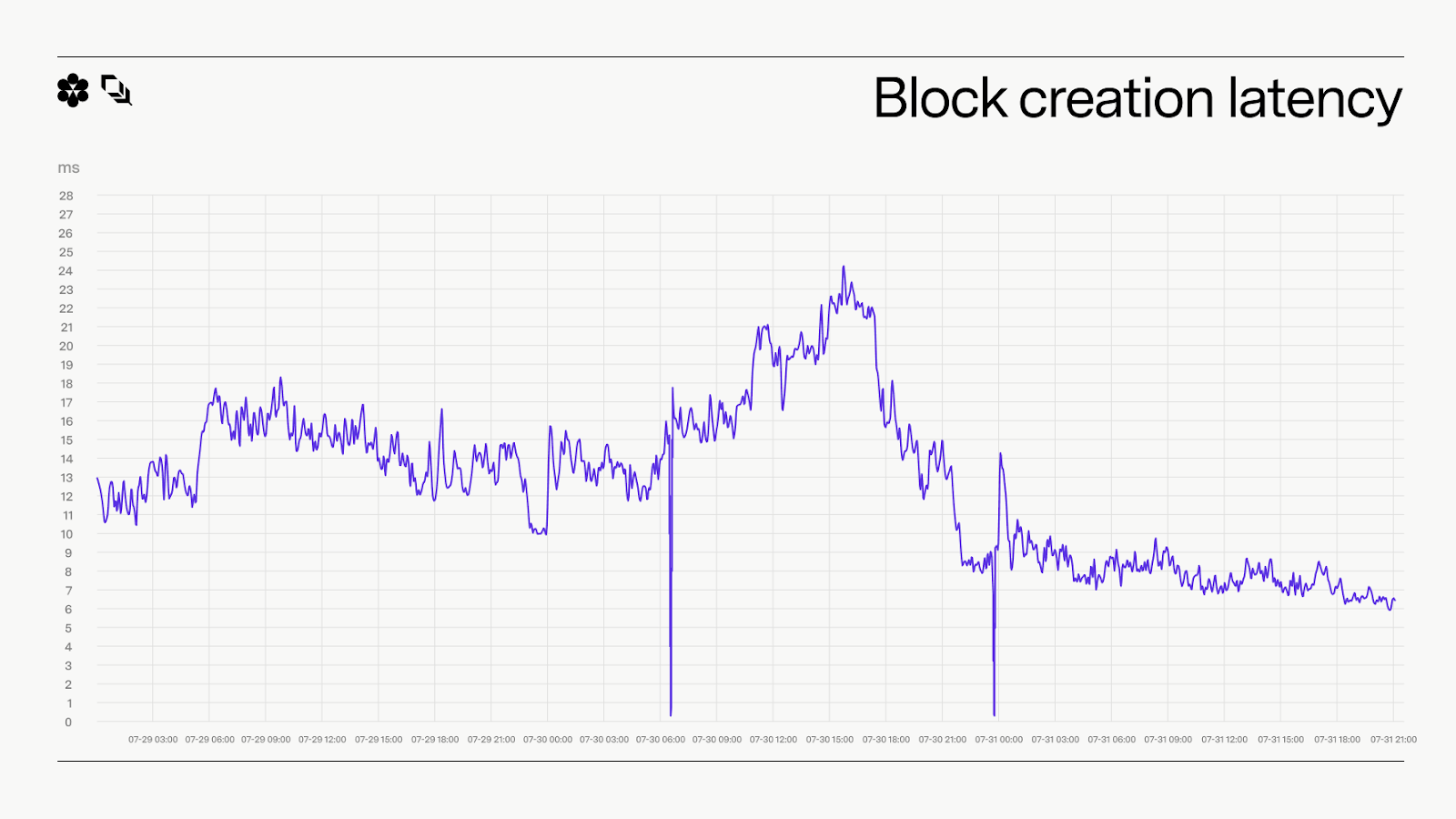 Meanwhile, the G2 sequencer ran smoothly throughout the spike - median block creation latency (p50) held at ~17 ms across the entire window, showcasing predictable block production even under peak load.