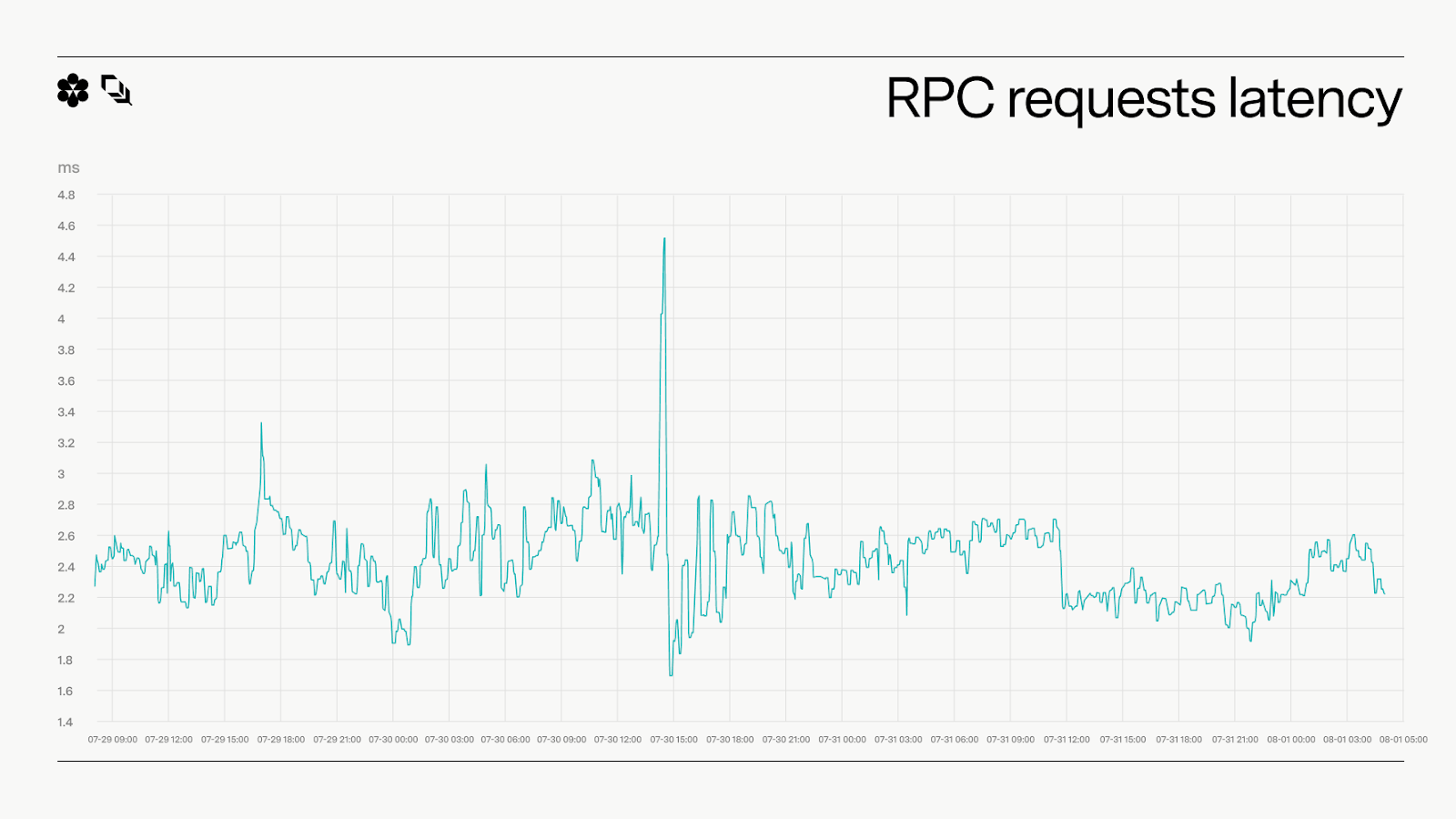 Median RPC request latency (p50) also stayed essentially flat through the spike, showing that the read path scaled with demand without introducing sustained latency regressions.