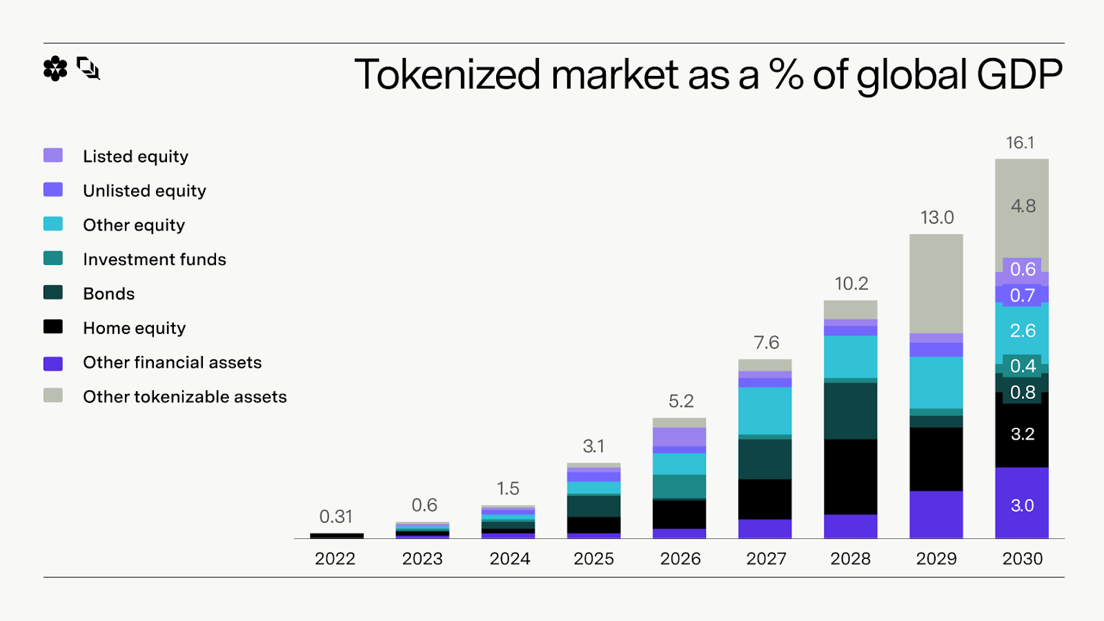 One widely cited estimate from BCG x ADDX projects tokenized assets growing from roughly $0.3T to ~$16.1T by 2030, roughly 10% of global GDP. But not all tokenization is created equal.