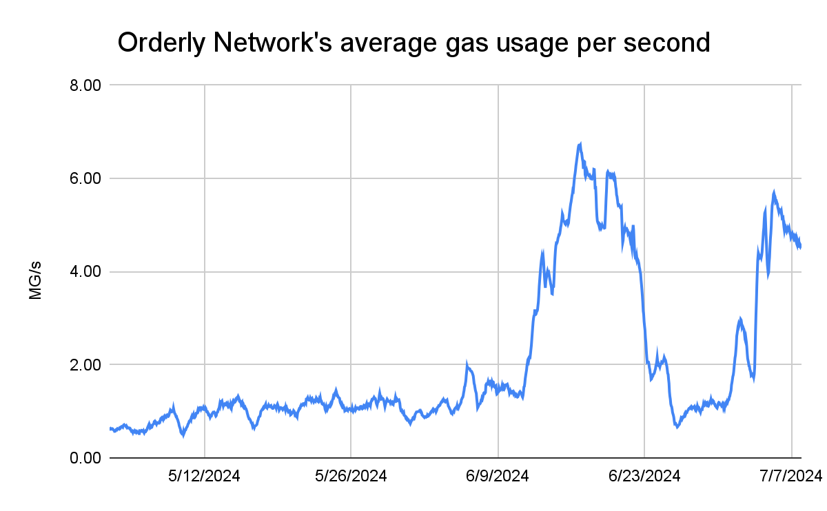 We look forward to continuing to support the Orderly Network, in particular by ensuring its settlement layer rollup is proactively upgraded to benefit from relevant network upgrades. One such upgrade that occurred recently is Fjord from Optimism. Among other things, Fjord enables OP Stack rollups to safely increase their gas limit to 200 megagas per second, enabling them to process more transactions per block. In preparation for Fjord, we increased Orderly’s upper gas limit from 20 megagas per second to 50, manually installing guard rails to ensure testing can be done safely. Since then, Orderly has achieved gas throughput of over 6.7 megagas per second, up from around 1.3 prior to the change — an increase of over 5x. We expect those gains to increase even more with Fjord.