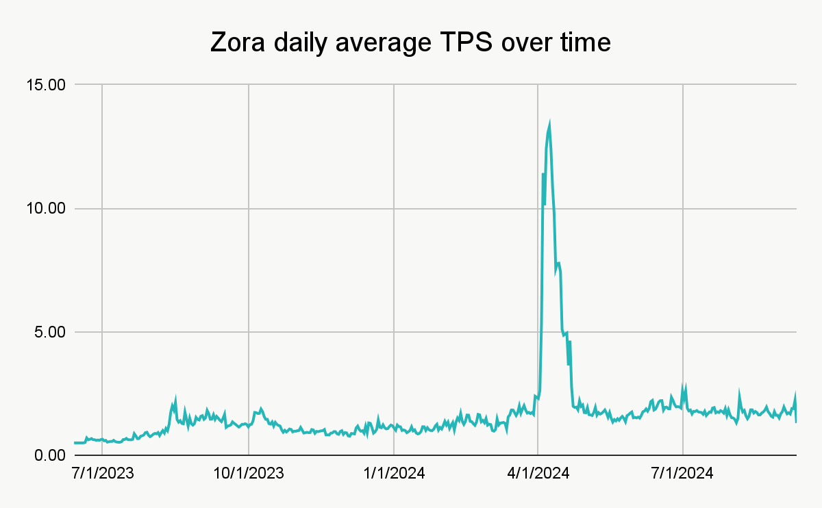 We saw this multiple times in April 2024. While Zora’s usual TPS of 1.5 to 3.0 generally places it in the top three of all OP Stack rollups, April 8 saw one of the platform’s biggest ever mints for the Total Solar Eclipse NFT, in honor of that day’s eclipse on the United States’ east coast. The mint saw TPS shoot up to over 13.3 TPS on Zora’s chain.