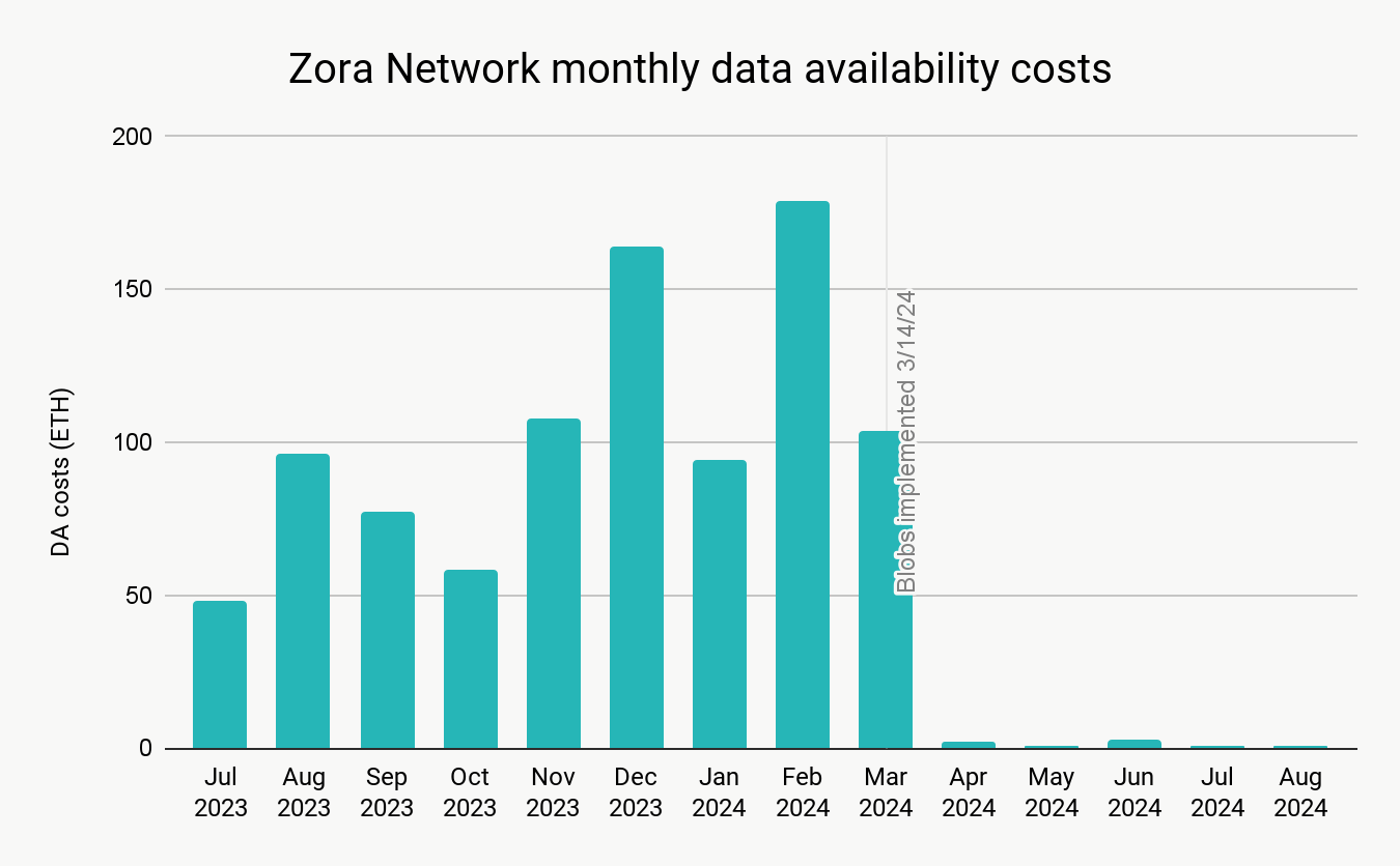 Since its first full month with blobs in April 2024, Zora Network now pays between 1 and 3 ETH monthly in data availability costs. The decline in fees opens up new possibilities for Zora, and the team didn’t have to lift a finger to implement the upgrade.