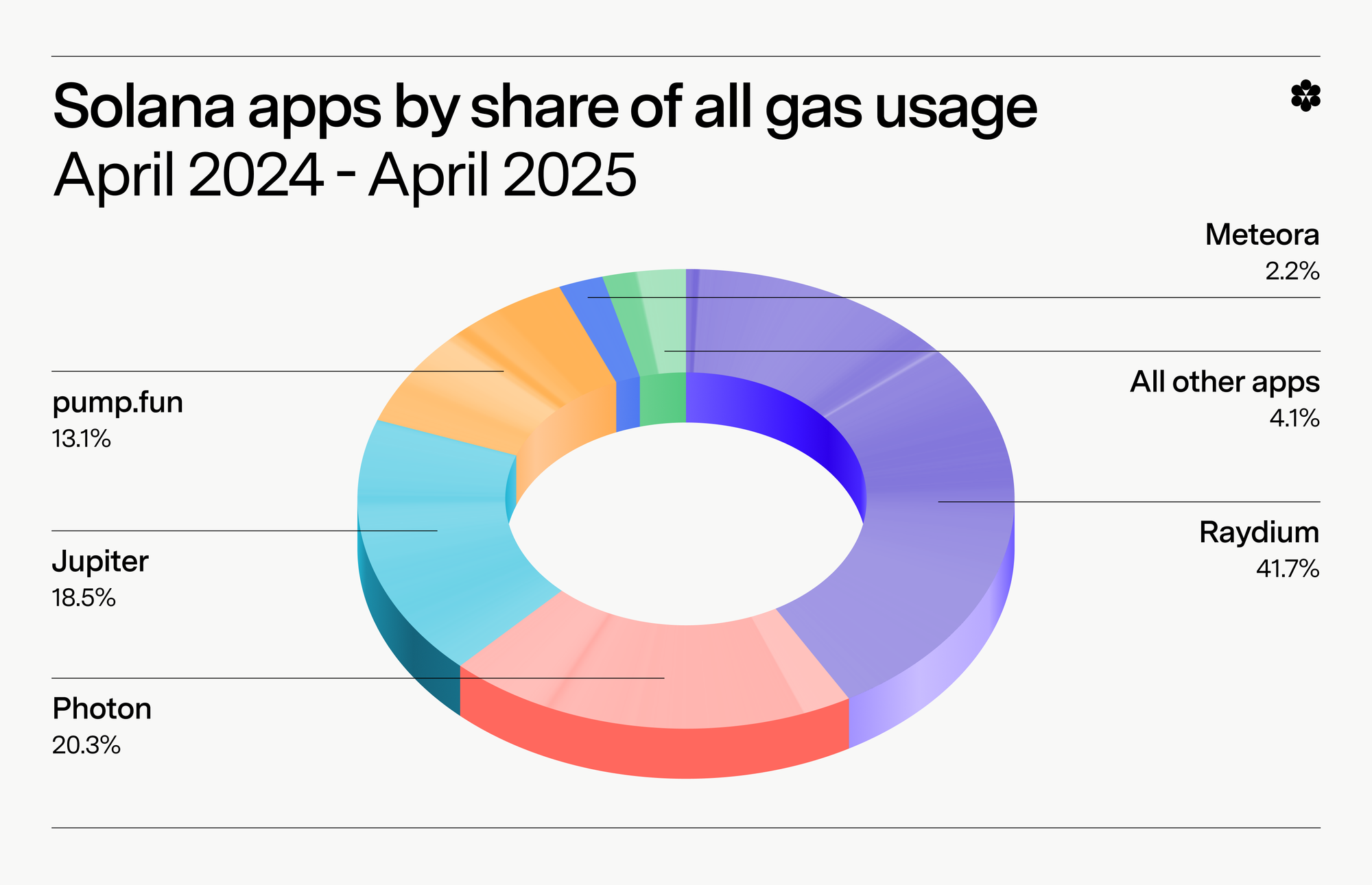 PumpFun has also been a cash cow for Solana and its validators. In our recent Gas Guzzlers Report, we found that PumpFun transactions have accounted for 13% of gas usage on Solana from April 2024 to April 2025.