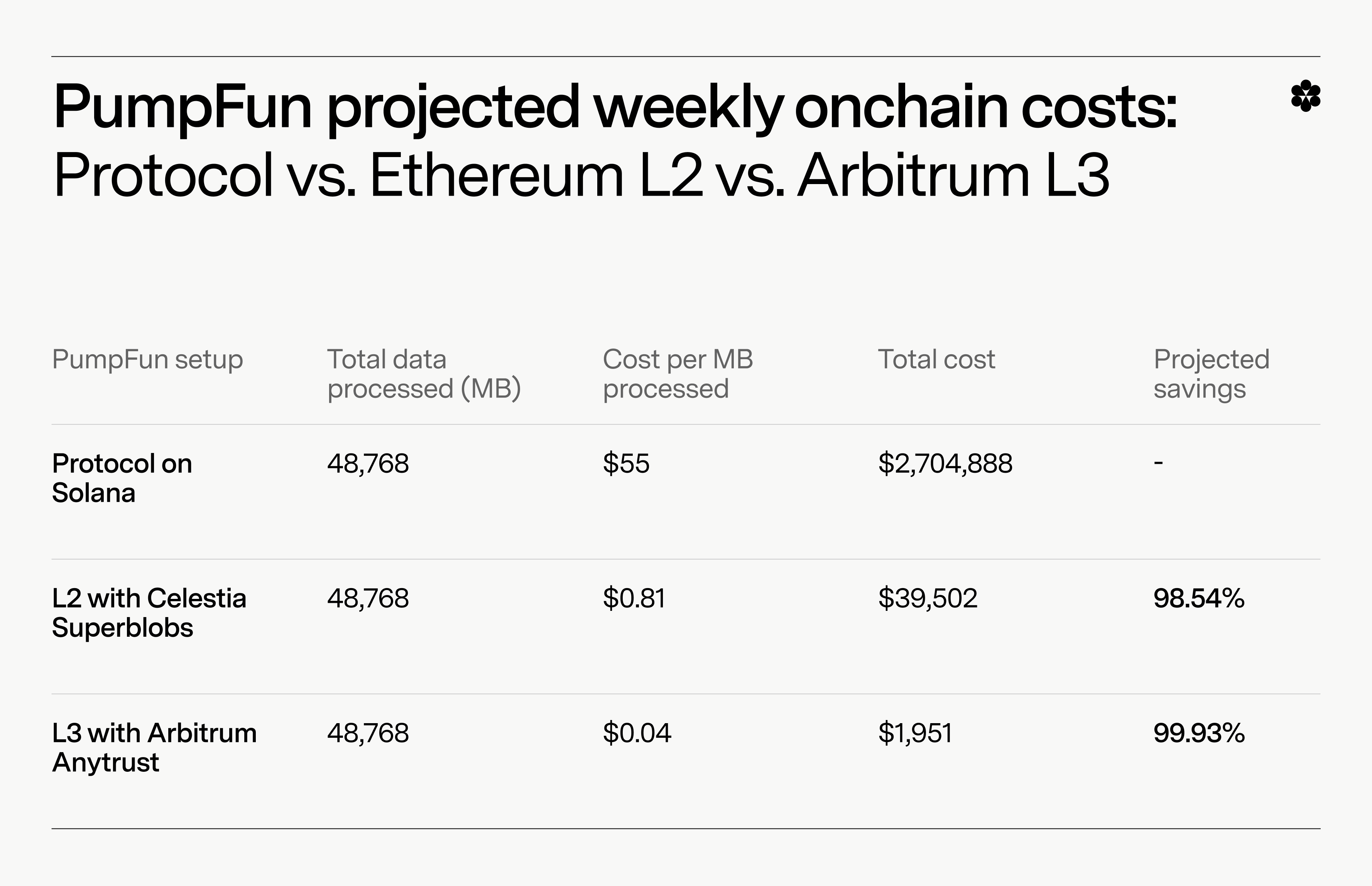 Our previous research has found that rollups can pay as little as $0.81 per MB processed as an Ethereum L2 using Celestia for DA, or $0.04 per MB as an Arbitrum L3 using AnyTrust. Either setup would allow an app processing the same data load as PumpFun to cut costs by over 98%, saving more than $2.6 million during the time period we study.