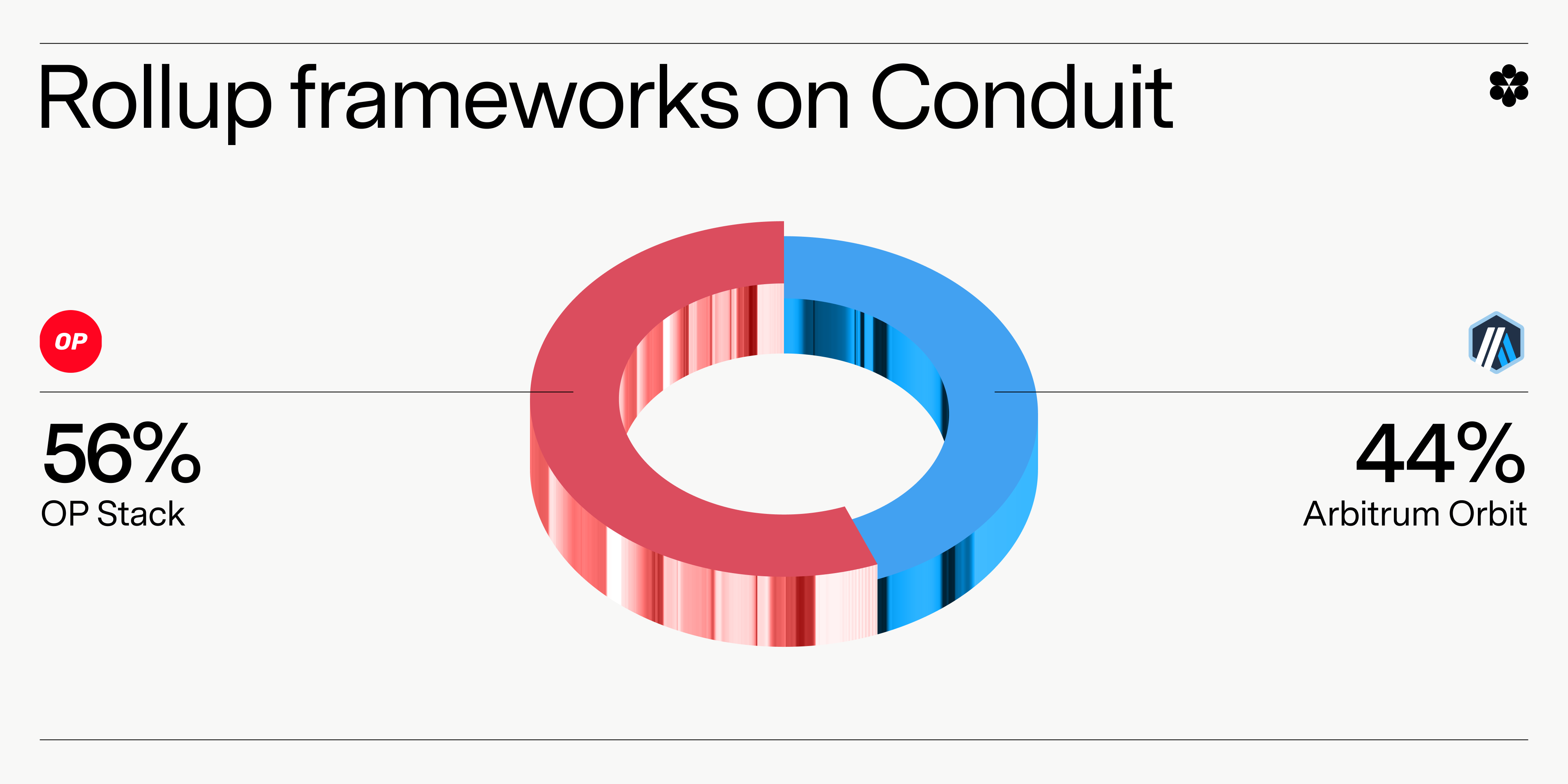 Which do Conduit rollups prefer? The data shows a nearly even split, with OP Stack rollups in front at 56% of mainnets on our platform.
