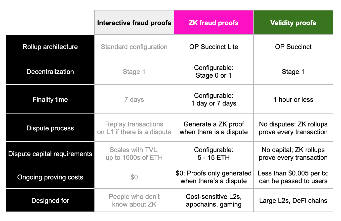 - More capital-efficient due to lower bonds. The simplification of the dispute process to a single ZK proof also makes the bond size needed to secure the chain up to 20x lower. The rollup operator can operate with more capital-efficiency, and the challenger role becomes much more accessible, enhancing decentralization.