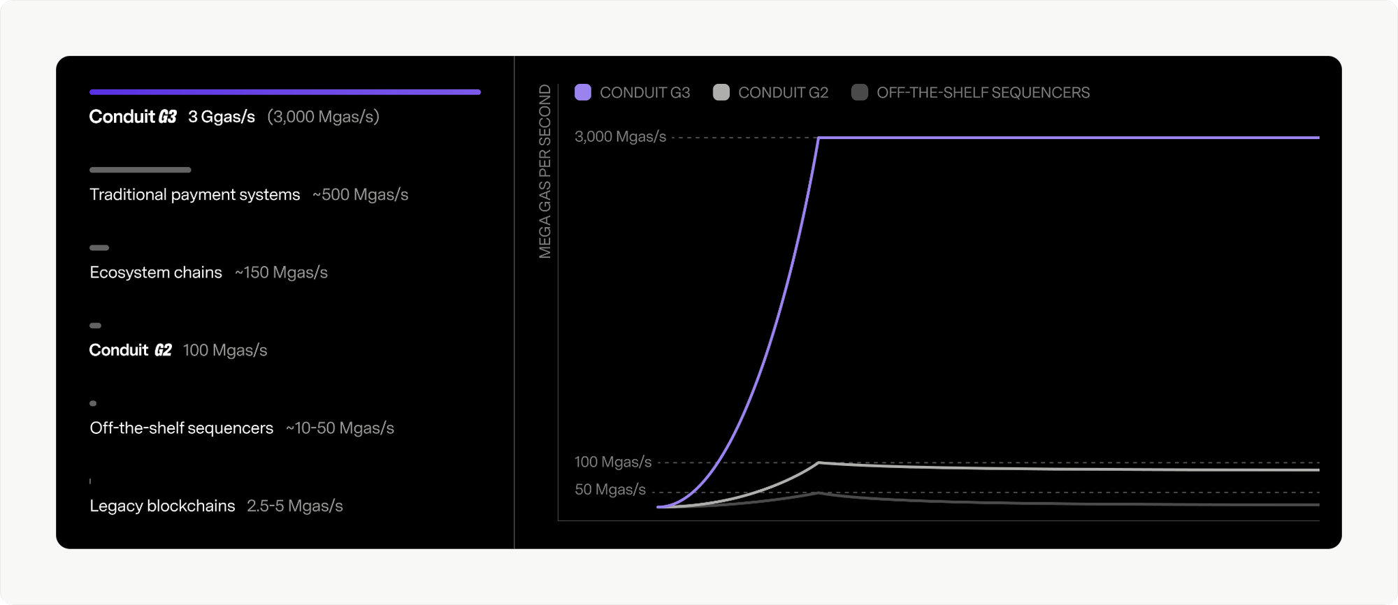 Through a new execution architecture, G3 delivers 3 Ggas/s of throughput, 30x higher than G2 and 60x more capacity than off-the-shelf sequencers, while cutting execution latency to ~10ms, over 5x lower than G2.